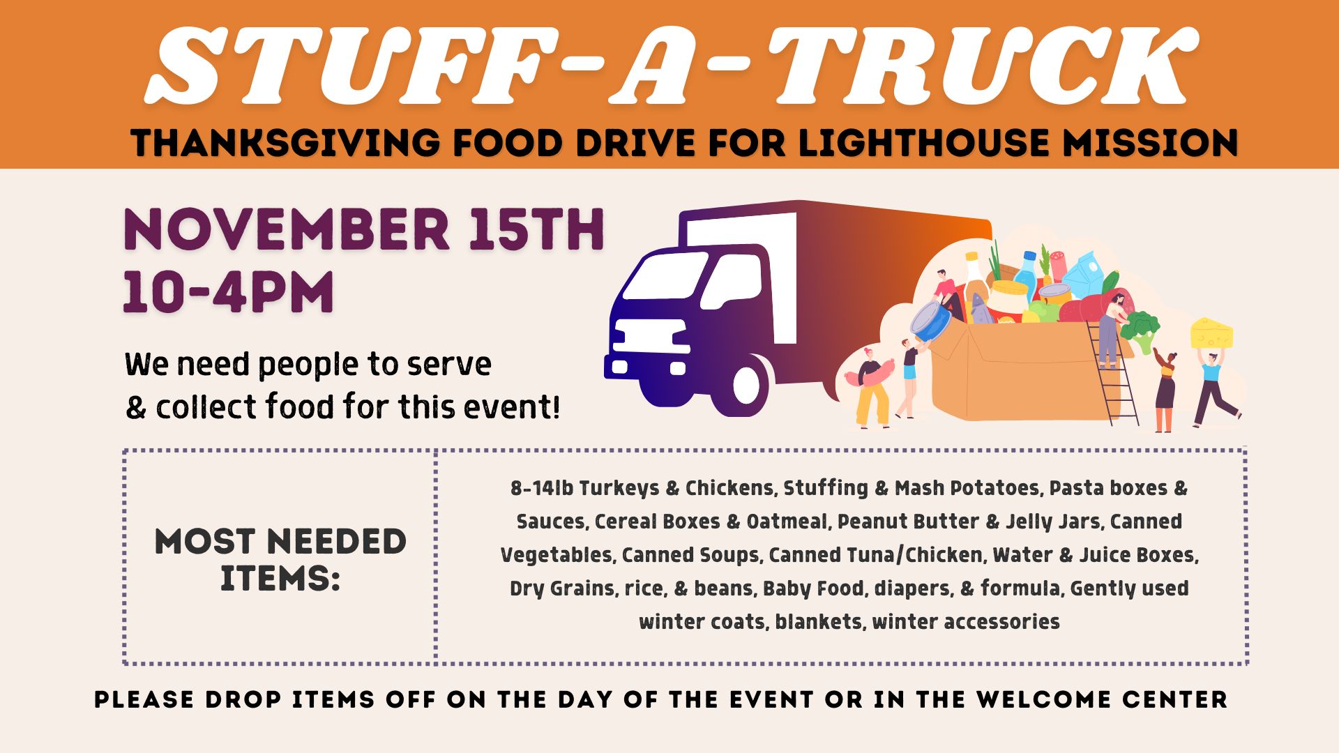 Join us for our annual serving event as we collect various food items, and warm clothing, such as gloves, hats, scarves, blankets, boots, and coats. Lighthouse Mission has come to depend on our church yearly, and we look forward to helping the community in the upcoming holiday season.